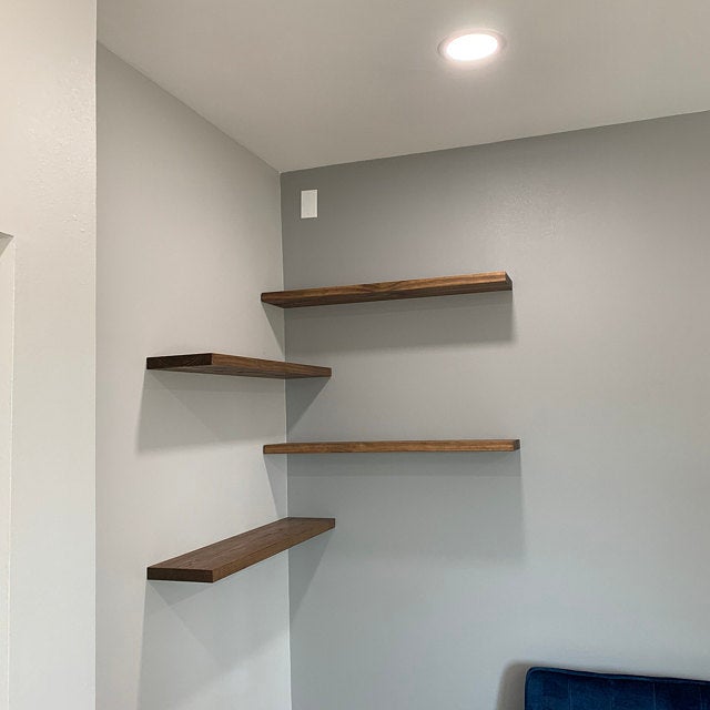 White oak is the most popular choice for this setup. Its warm, consistent grain reads as cohesive across both shelves, which makes the L formation look like one continuous piece. Browse the white oak floating shelves collection.