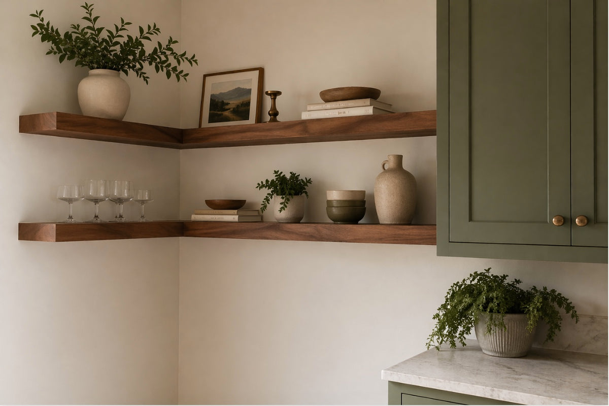 Kitchen is the highest-demand application. Kitchen corners are notoriously difficult: too awkward for cabinets, too visible to leave blank. A stacked L formation above a countertop or sink turns dead wall space into a full open shelving run. See the kitchen floating shelves collection for more.