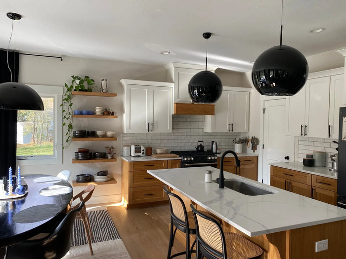 Open shelving above the counter in solid walnut or white oak replaces upper cabinets with something that feels warmer, more personal, and more interesting. A full run holding dishes, glassware, and everyday objects turns the wall above the counter into the room's most compelling feature. Browse kitchen floating shelves.