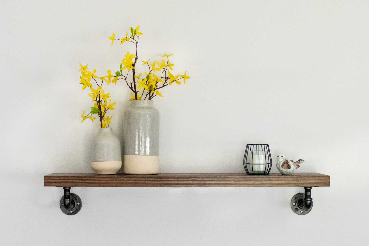 This durable solid wood and steel "L" pipe bracket shelf design is constructed from locally sourced pine wood and industrial grade pipe. Add character to your living room, kitchen, bathroom or even garage! The included fittings are industrial grade and are cleaned and painted prior to shipping. This design combines the modern look of clean edge wood, with the industrial look of the steel pipes.
