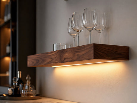 Bar walls are where it really shines. The rich grain is the perfect backdrop for a spirits display: it makes bottles pop, creates contrast against backsplash tile, and gives the whole setup an upscale feel that lighter woods can't match. See the bar floating shelves collection for more.