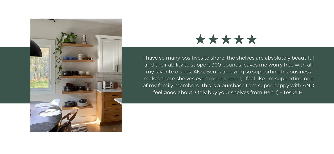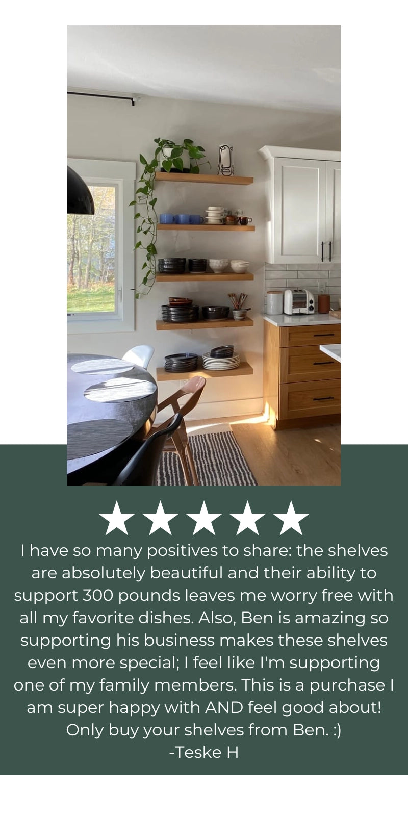 These solid maple shelves were absolutely beautiful and sized perfectly to the dimensions I needed. The mount he uses is truly heavy duty unlike anything else you are probably looking at. The owner is great to work with.